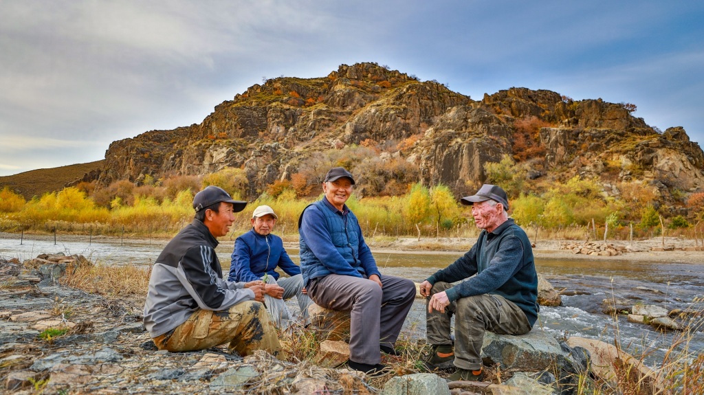 高金山(右一)坐在山下和老友聊天。(摄影:白敖敏)