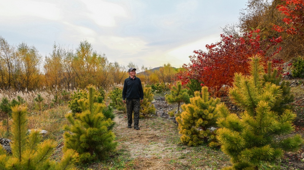 天高云淡,层林尽染。初见高金山老人时,他正挥舞着铁锹忙着给新栽植的小树固土培根,黝黑的脸庞上布满了岁月深深的痕迹。身旁的一棵棵树木婀娜多姿,毫不吝啬地为大地涂上色彩,在山坡之上昂然挺立,焕发着勃勃生机。