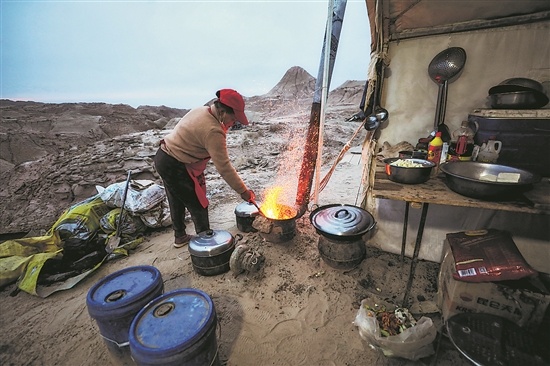 帐篷外,早起忙活了1个多小时的谭淑芳大姐终于可以松口气了。早晨7点起床为8位工人做早饭,送走他们,简单休整后,她又要开始准备午饭,要赶在11点前出发,背着8个人十多斤重的午餐翻山越岭1个多小时,送到工人的钻井点位,送饭来回需要3个多小时。而早上摸黑出去的工人们结束一天工作返回时,将披星戴月。
