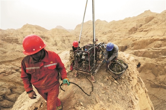 11月7日上午,在北喀山一山顶,伴随着浑厚的号子响彻山谷,一台钻机从另一个山顶用绳索拉了过来。为了取得更准确详实的勘探数据,有些钻井点就在山峰之上,他们只能通过这种原始的方式,人拉肩扛搬运设备。