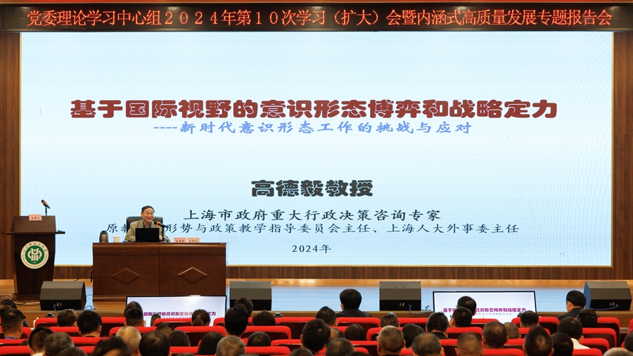 10月24日下午,党委书记张力主持召开党委中心组2024年第10次学习(扩大)会暨内涵式高质量发展专题报告会。会议邀请上海市政府重大行政决策咨询专家、原教育部形势与政策课教学指导委员会主任、原上海市人大外事委主任高德毅教授,为与会人员带来一场精彩的意识形态专题报告。