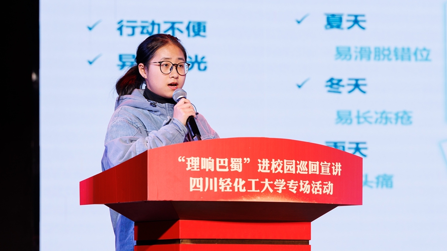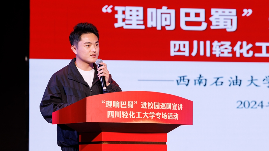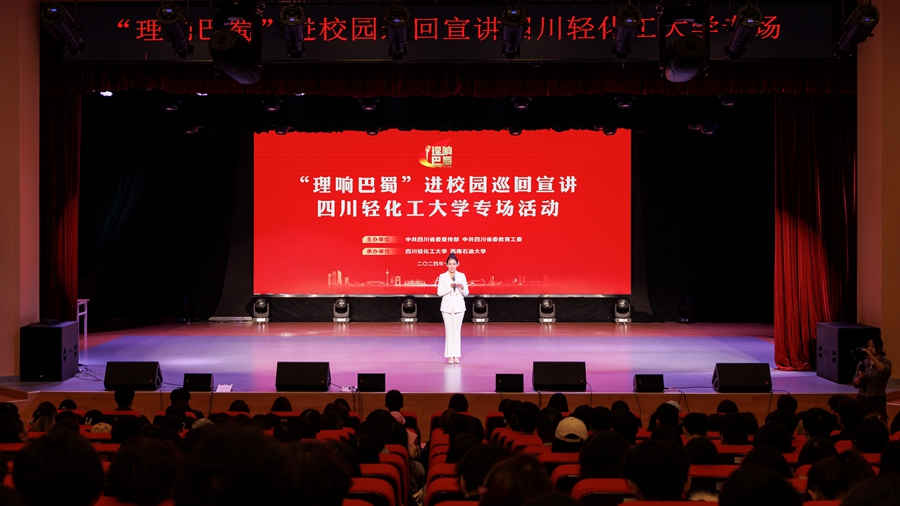 “理响巴蜀”进校园巡回宣讲活动采取“宣讲+文艺”的形式进行。宣讲间歇的朗诵《652 赋》将活动氛围推向又一高潮。这首赋深情回顾了“三线建设”时期的峥嵘岁月,高度颂扬了川轻化师生传承弘扬“652”精神的时代担当。不仅强化了同学们的爱校荣校之情与使命感,更令他们对当下得之不易的学习环境倍加珍视,心怀感恩。