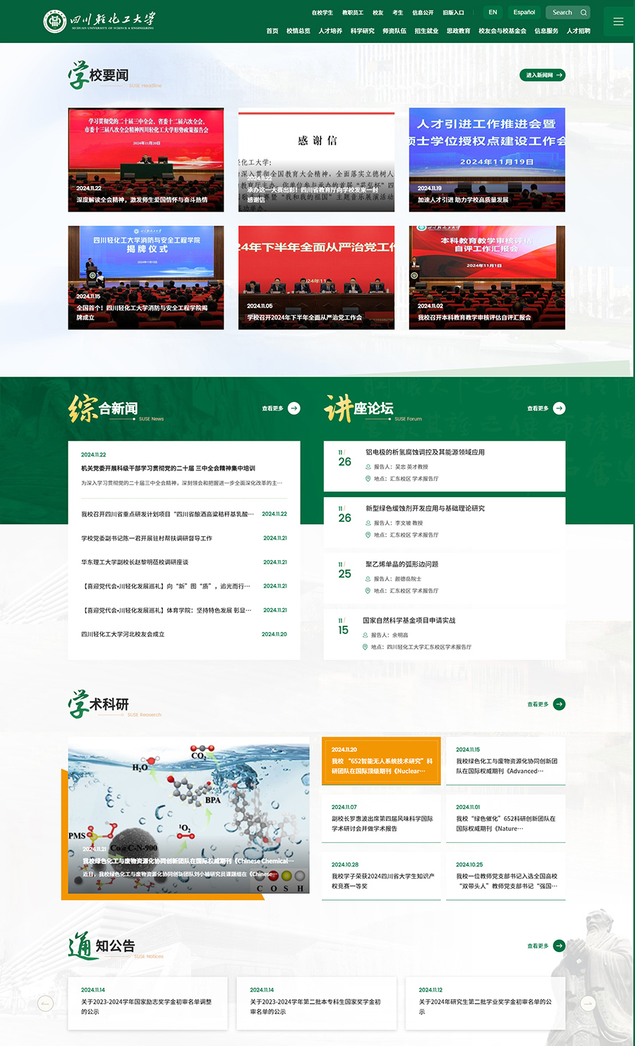 此次校园网主站改版还对二级页面和信息浏览页面进行统一更新和界面升级,营造整体风格和谐统一的视觉效果,增强川轻化品牌的辨识度和吸引力,营造一个既赏心悦目又高效实用的系统化、数字化的浏览新空间。
