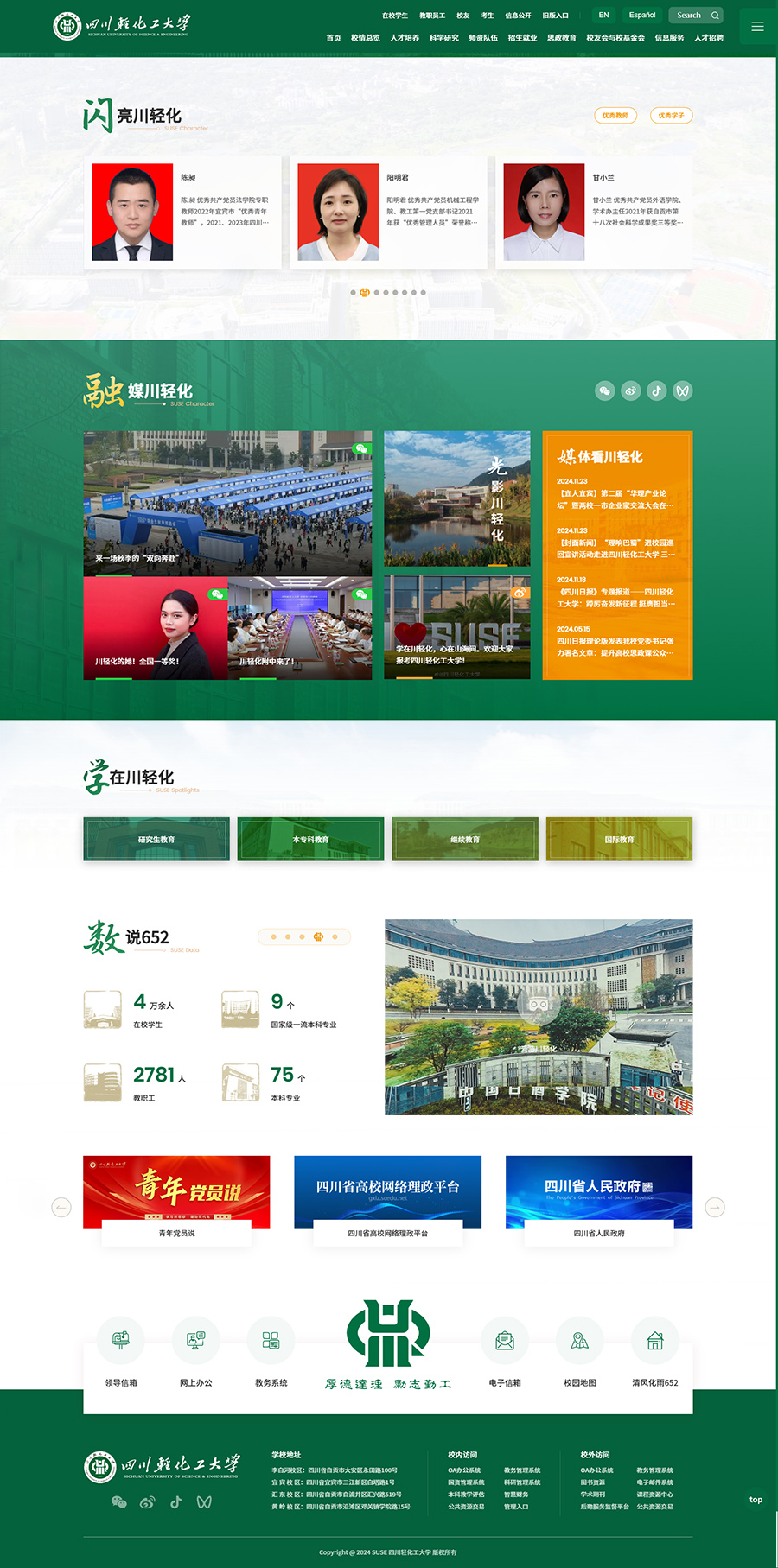 在页面底部,新增【学在川轻化】和【数说652】板块,对外展示学校在教育教学成就方面的快速链接,满足不同群体的访问需求,快速直达信息窗口。让数据说话,集中展现学校在学科门类、专业设置、科研平台、师资力量、科技创新等方面的核心数据指标,简单直观地介绍学校基本情况、发展态势。