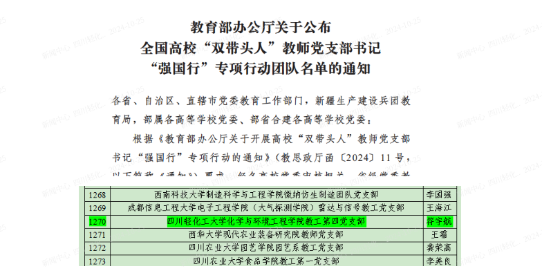 近日,教育部办公厅发文,公布了全国高校“双带头人”教师党支部书记“强国行”专项行动团队名单,我校化环学院教工第四党支部书记符宇航成功入选,这是我校基层党建工作的新突破。