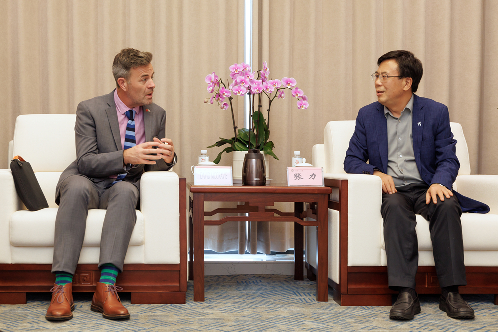 党委书记张力在李白河校区1102会议室首先接见了代表团一行。他说今年正值我校60周年校庆,一直以来,高质量的国际合作交流是学校非常重视且努力的方向,近年来的国际化发展也得到了相关部门的高度认可,取得了一些成就,与切斯特大学的合作也是这种成就的证明之一,学校非常欢迎国际合作伙伴常来往、多交流,为将来的合作奠定良好的基础。