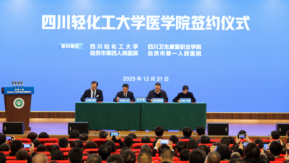 12月31日上午,四川轻化工大学李白河校区学术报告厅内气氛庄重热烈。四川轻化工大学、四川卫生康复职业学院、自贡市第四人民医院、自贡市第一人民医院四方在此举行共建四川轻化工大学医学院签约暨揭牌仪式。这标志着川南渝西区域医学教育与医疗卫生事业融合发展迈入全新阶段,是学校发展进程中具有里程碑意义的重要时刻。