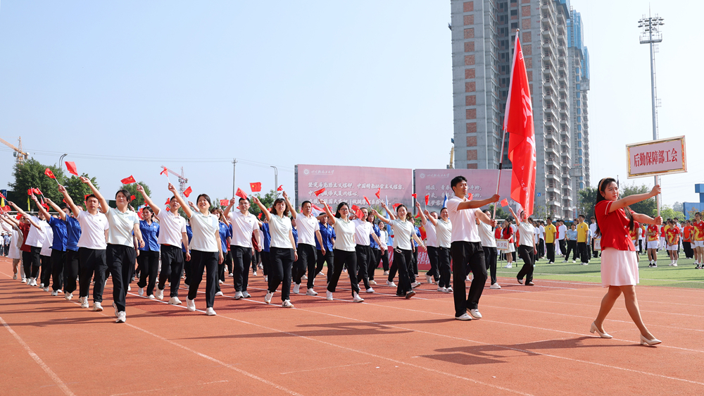 各学院方队依次入场,将运动场化作青春风采的展示舞台。同学们身着统一服装,步伐矫健,口号嘹亮,尽显轻化工人的朝气蓬勃与奋进热血。有的方队手持创意道具,用斑斓色彩描绘运动激情;有的方队踏歌而行,将旋律融入每一个步伐;有的方队以高难度体操动作和整齐划一的队列,展现过硬素质。各方队创意迭出,或挥舞花束,或变换队形,青春的笑脸与飘扬的旗帜交相辉映,将现场气氛一次次推向高潮。